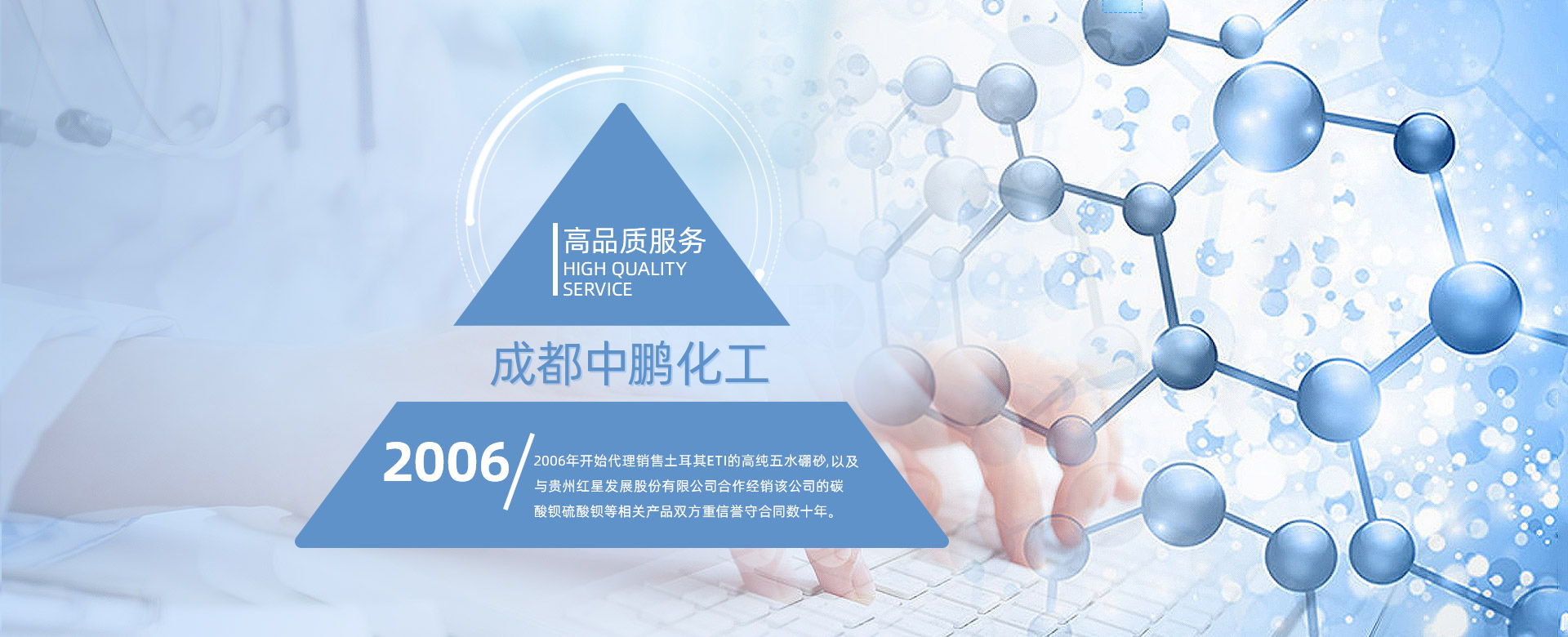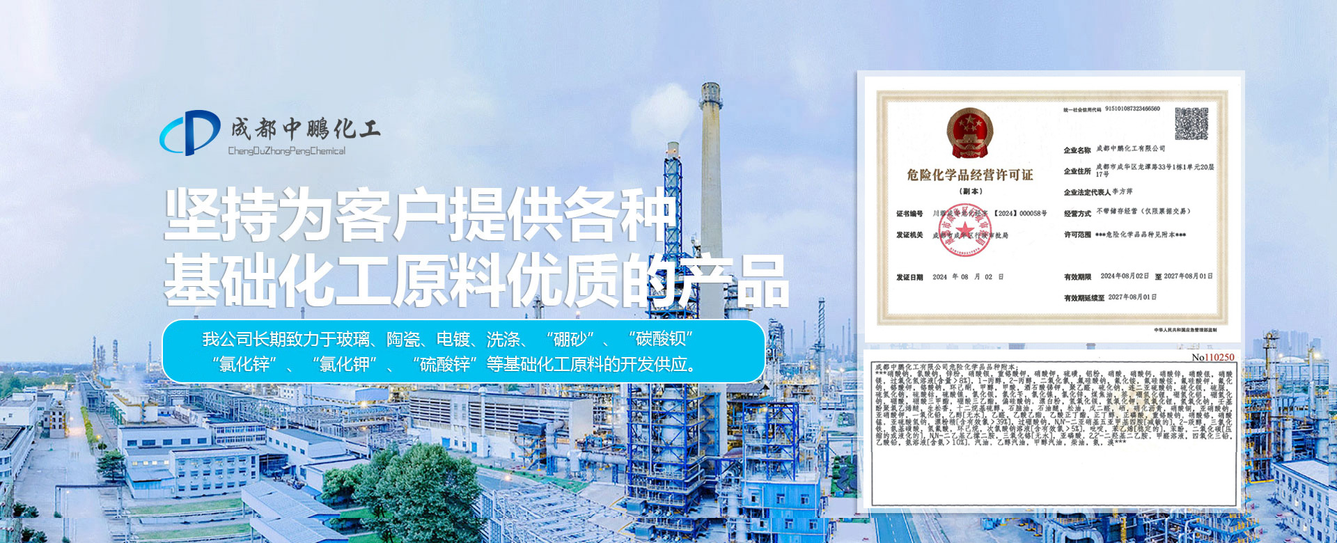 成都中鵬化工有限公司成立于2001年,位于成都市新都區(qū)木蘭木名商塑化城2棟11號,公司成立16年以來,一直堅持為客戶提供各種基礎(chǔ)化工原料的產(chǎn)品。我公司長期對于玻璃、陶瓷、電鍍、洗滌、“硼砂”、“碳酸鋇”、“氯化鋅”、“氯化鉀”、“硫酸鋅”等基礎(chǔ)化工原料的開發(fā)供應。 公司現(xiàn)在員工上百人,在全國擁有多個營銷體系和完善的售后服務體系,長期以來,通過為客戶提供各種基礎(chǔ)化工原料的產(chǎn)品,形成了良好的合作關(guān)系...